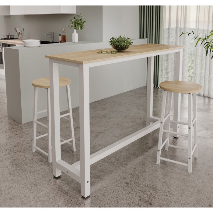 Conjunto de mesa alta y taburetes para optimizar tu hogar en color blanco y efecto madera sonoma. Este set de estilo moderno y líneas limpias es la solución ideal para espacios pequeños. Crea un rincón acogedor para tus desayunos, comidas o como un espacio de bar para recibir a tus amigos. La mesa alta cuenta con tres estantes laterales que ofrecen un almacenamiento extra, perfecto para organizar tus objetos esenciales. Los taburetes, con su diseño a juego, tienen patas regulables para adaptarse a cualquier superficie. Un conjunto funcional y decorativo que te ayudará a ganar espacio y a mantener el orden en tu cocina o salón. Fabricado con un tablero de melamina mate, resistente y duradero, y una estructura metálica robusta, este set está diseñado para el uso diario sin renunciar al estilo.