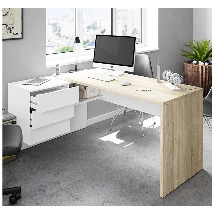 Escritorio esquinero con cajones modelo Deltebre color sonoma y blanco