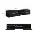 Eleva el estilo de tu salón con nuestro mueble TV moderno con patas, un mueble asequible con un precio bajo para renovar tu hogar. Su diseño minimalista combina una estructura de melamina mate con una puerta de MDF en PVC de alto brillo en color negro, creando un contraste sofisticado. Las luces LED azules realzan el estante de cristal, perfecto para exhibir tus objetos favoritos y crear un ambiente único. Las puertas con cantos redondeados y el sistema de apertura push-click eliminan la necesidad de tiradores, aportando un acabado limpio y elegante. Este mueble barato y de calidad es la pieza ideal para un salón moderno, combinando estética, almacenamiento y un toque de luz.