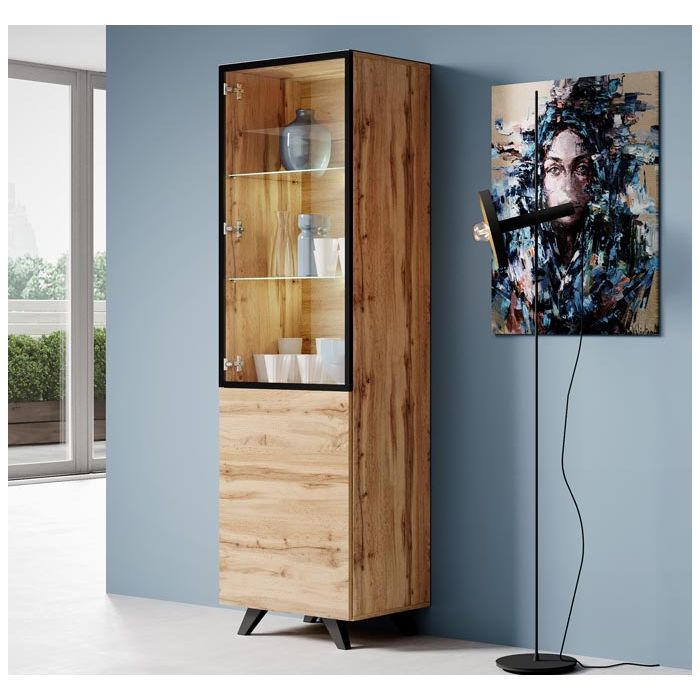 una puerta opacas roble wotan, detrás 2 estantes del mismo material. Fácil apertura.Principales características de la Vitrina: