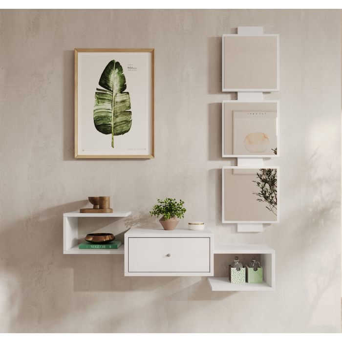 Optimiza tu espacio de entrada con este novedoso y original recibidor suspendido en color blanco con un diseño único. Este mueble te permite transformar tu vestíbulo, oficina u hogar con su estilo moderno y elegante. El recibidor está compuesto por una consola con un cajón donde puedes guardar llaves, carteras o cualquier accesorio que necesites tener a mano. Su diseño minimalista y de líneas limpias le da un toque de sofisticación a tu pasillo. Además, puedes decorar la superficie de la consola con fotos, plantas o una lámpara pequeña. Este mueble no solo es práctico, sino que también crea una sensación de amplitud y luminosidad gracias a su espejo triple. El conjunto incluye dos estantes flotantes con forma de U, perfectos para añadir más decoración y personalidad a tu espacio