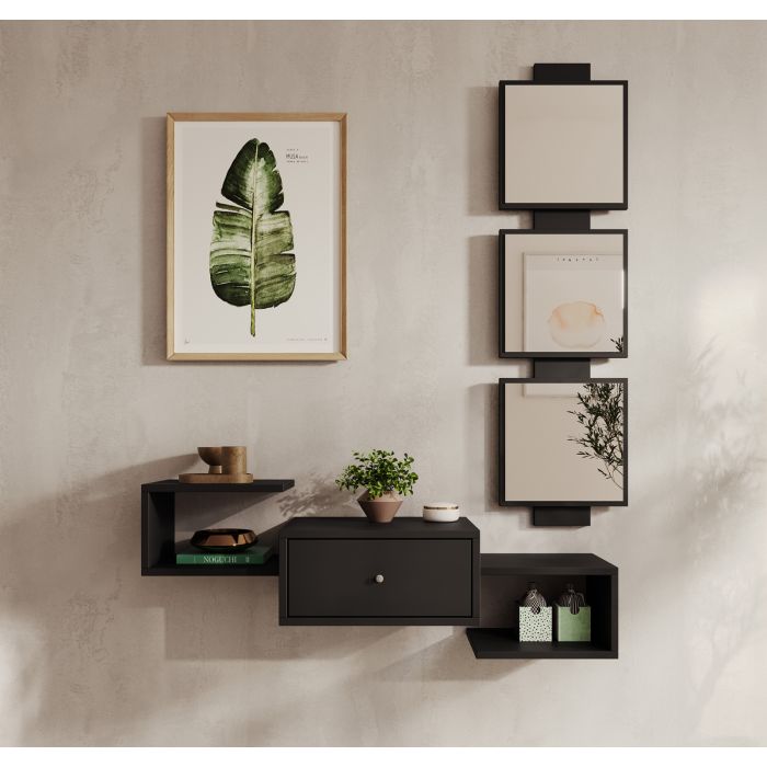 Optimiza tu espacio de entrada con este novedoso y original recibidor suspendido en color negro con un diseño único. Este mueble te permite transformar tu vestíbulo, oficina u hogar con su estilo moderno y elegante. El recibidor está compuesto por una consola con un cajón donde puedes guardar llaves, carteras o cualquier accesorio que necesites tener a mano. Su diseño minimalista y de líneas limpias le da un toque de sofisticación a tu pasillo. Además, puedes decorar la superficie de la consola con fotos, plantas o una lámpara pequeña. Este mueble no solo es práctico, sino que también crea una sensación de amplitud y luminosidad gracias a su espejo triple. El conjunto incluye dos estantes flotantes con forma de U, perfectos para añadir más decoración y personalidad a tu espacio.