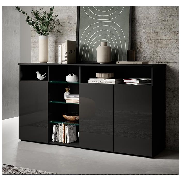 Estructura y puertas con acabado en melamina brilloEstantes de vidrio